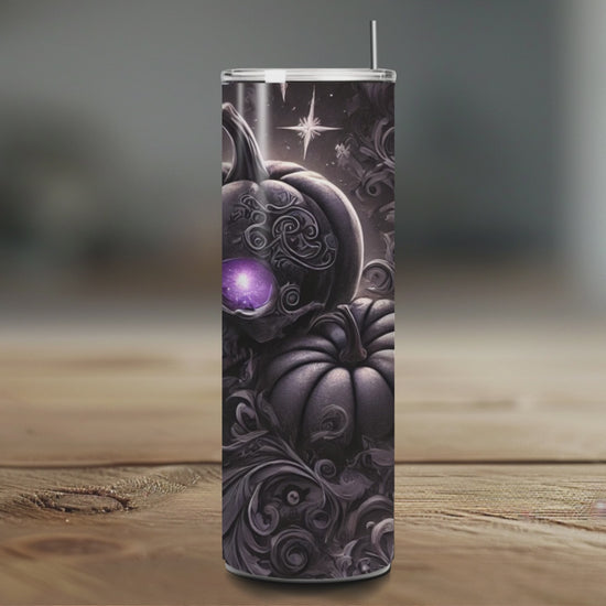 💀Gothic Halloween Tumbler 20oz – Black Pumpkin with Skull & Bat | Stainless Steel Cup with Purple Glow