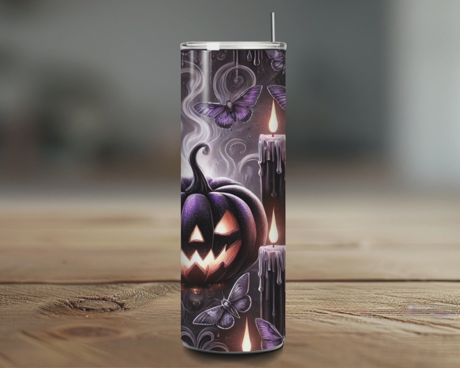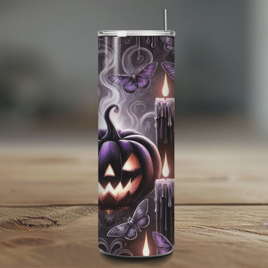 🕯️Gothic Halloween Tumbler 20oz – Black Pumpkin with Candles & Butterflies | Double-Walled Stainless Steel Mug