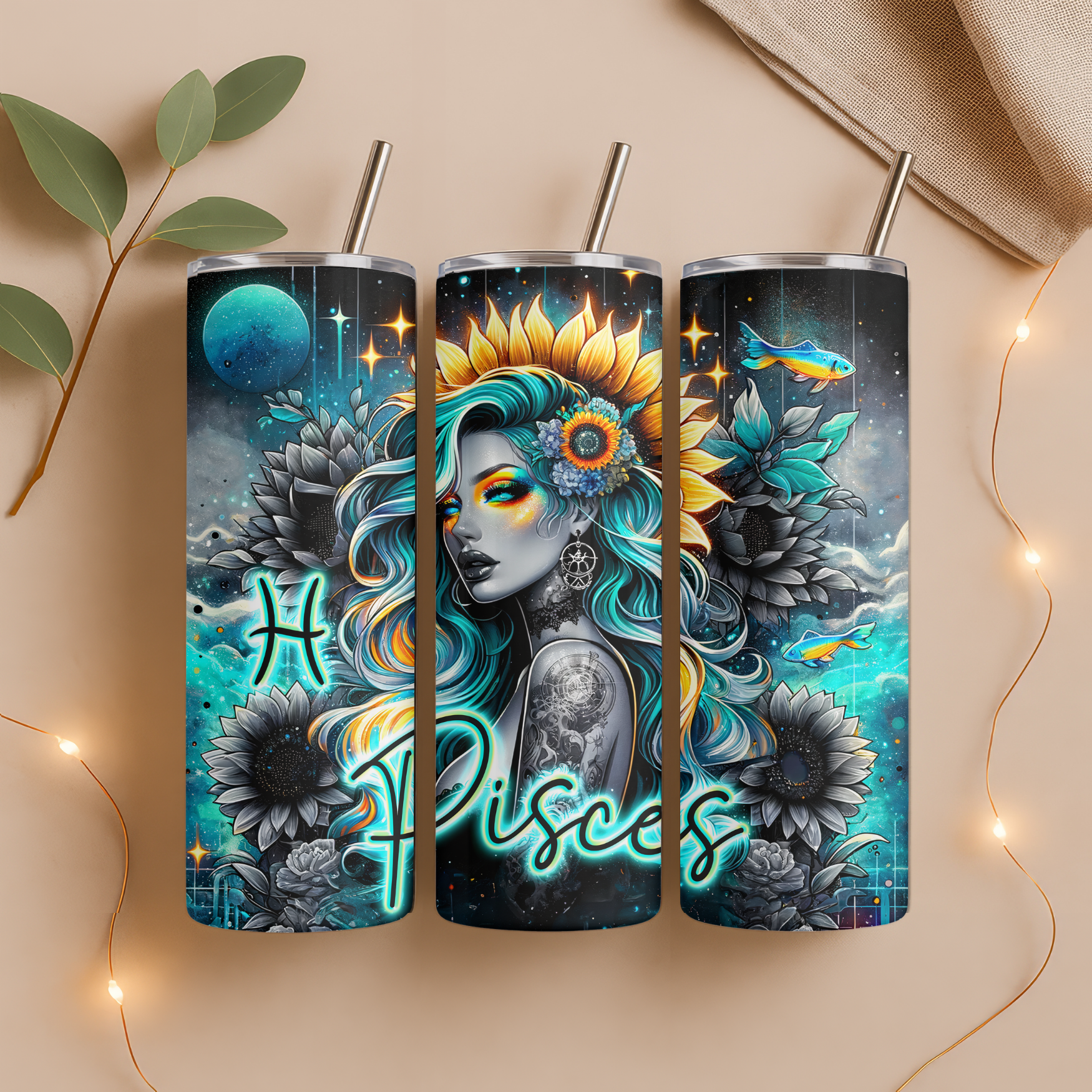 Our exclusive Zodiac Tumbler collection combines all 12 signs of the zodiac in a unique fantasy design with bright neon colors, sunflowers, and cosmic details.